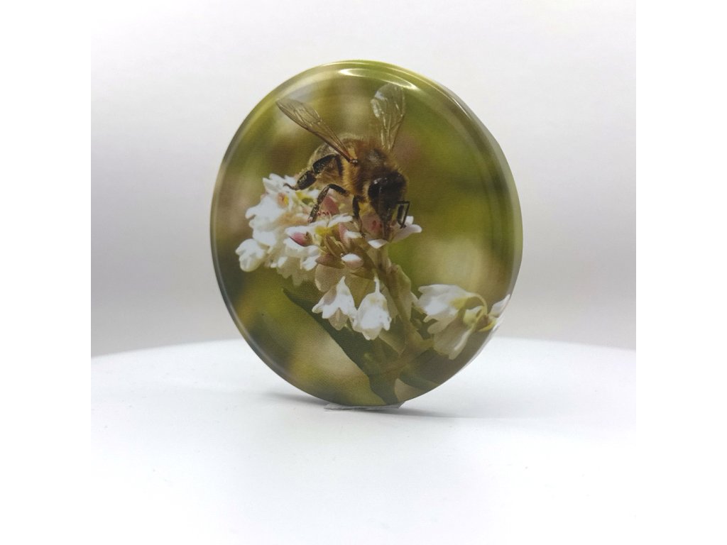 Skrutkovací viečko TWIST 82 včela na pohánke k poháru na zaváranie je viečko uzáverom typu RTS. Vhodné pre včelarov na med. Priemer: 82 mm