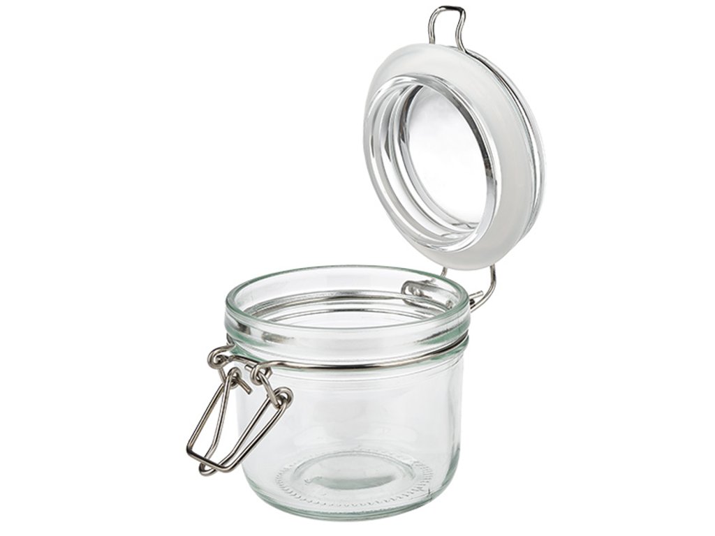 Kulatá skleněná dóza - patentní sklenice je odolná proti převrácení díky praktickému rychlouzávěru. Ideální pro malé množství. Skládá se ze skleněného dna, skleněného víka, bílého silikonového kroužku a kovového drátěného uzávěru. Dodává se kompletně smontované. Snadno se otevírá a zavírá bez námahy. Díky těsně přiléhajícímu gumovému těsnění zůstane vše ve dóze déle čerstvé a uchováváno.