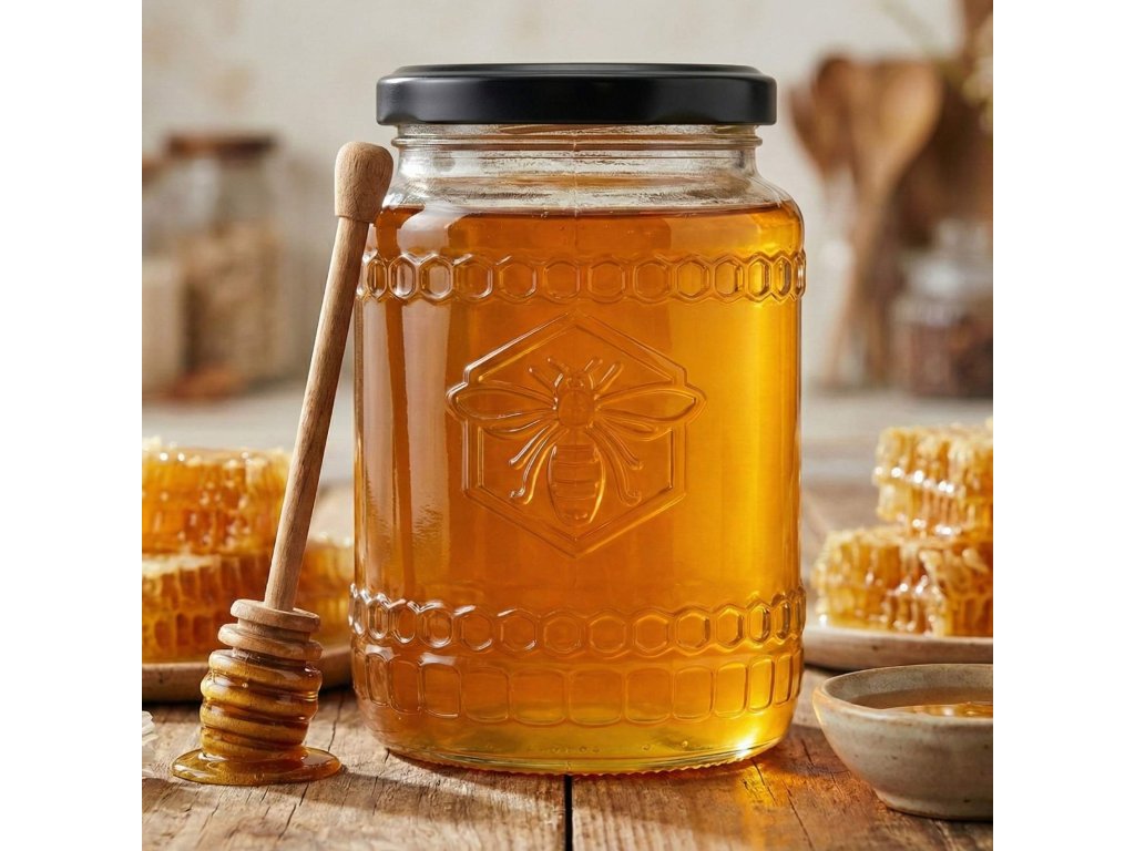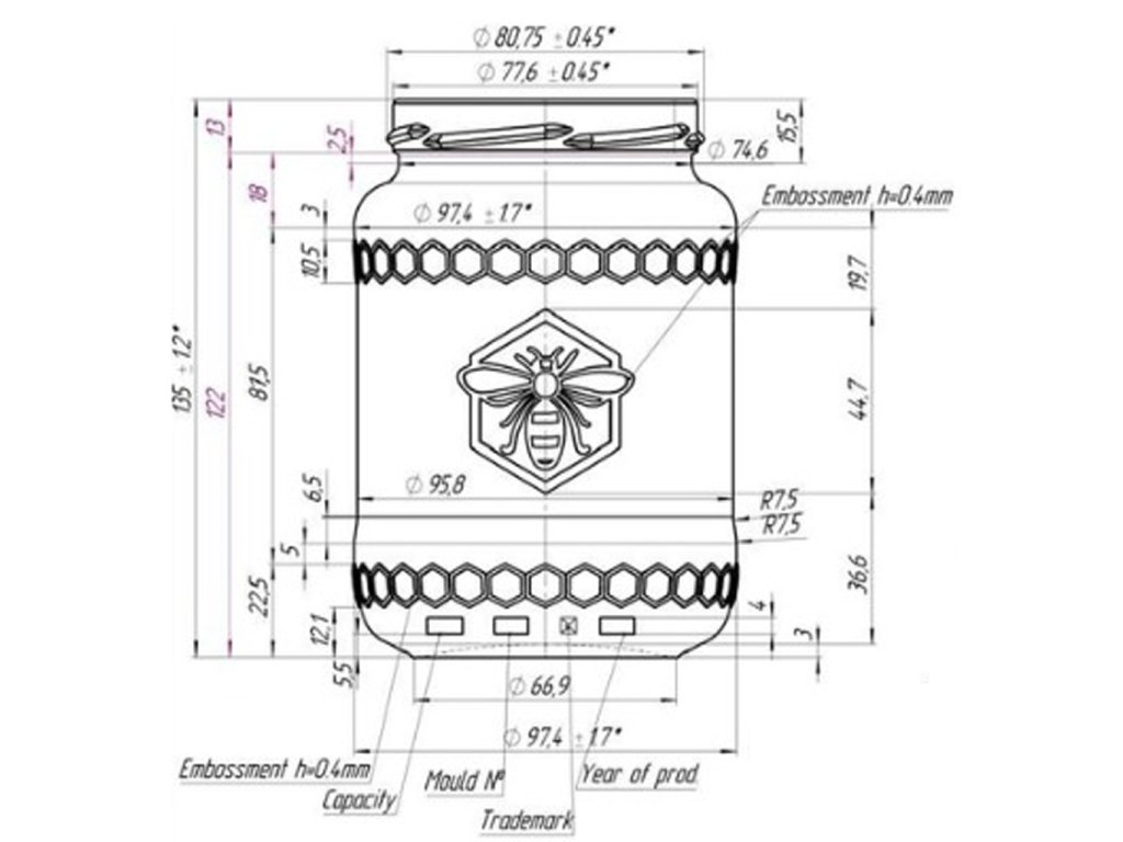 Sklenice o objemu 730 ml (cca 1 kg medu) zaujme na první pohled dominantním reliéfem včely a detailním dekorem plástve na lemech. Spolu s elegantním černým matným víčkem tvoří prémiový obal, který podtrhne kvalitu vašeho medu. (Víčko není součástí sklenice!)